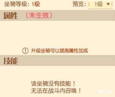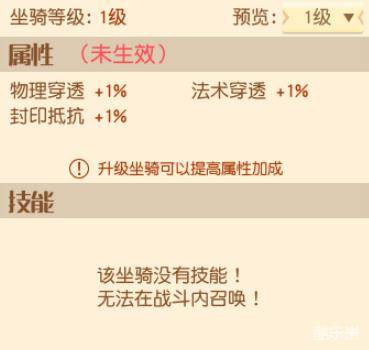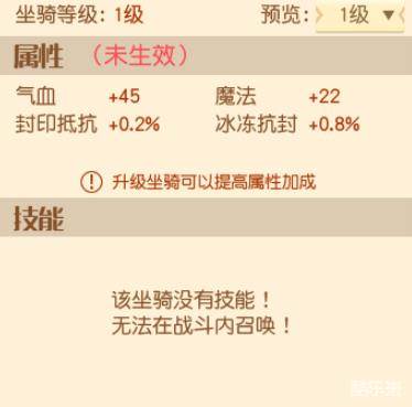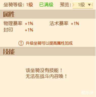 坐骑等级目前1级是满级,属性是增加物理、法术暴率和封印,没有技能无法在战斗中召唤(也就是说当你在战斗中无法召唤这只坐骑出来帮你打架,宠物坐骑有)