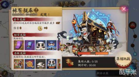 发现胧车后会有3-6分钟的集结时间,玩家可在集结场景备战,开战之后禁止再次加入。战斗的难度与集结参战的人数自动匹配,且低等级玩家不会增加挑战难度。BOSS存在20分钟,逾期将逃之夭夭,请玩家们细心准备,把握良机!