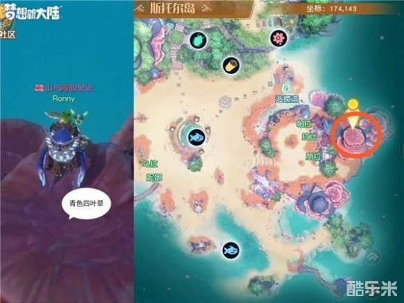 然后租赁坐骑,到斯托尔岛坐标174.143捡起青色四叶草完成任务。具体位置如下图: