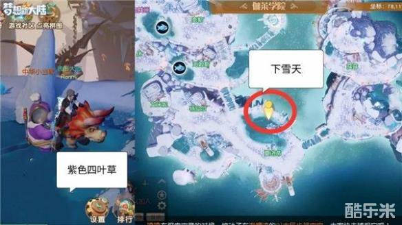 奇遇紫色四叶草:伽莱学院坐标79.118,天气为下雪,捡起地上的紫色四叶草完成任务。具体位置如下图: