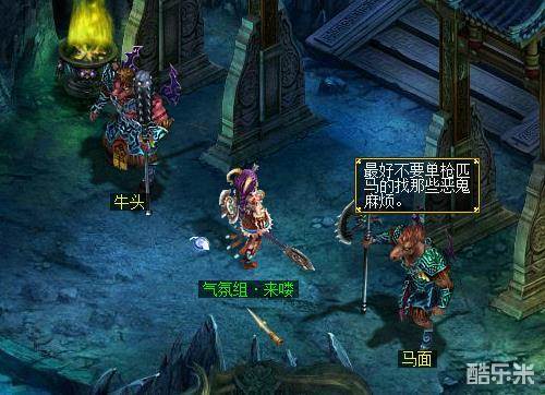 进入地府之后,玩家首先遇到的就是地府守护神“牛头马面”,其中牛头为物理攻击型boss,马面为法术攻击型boss。两人的血量和攻击都不算高,在前期玩家可以安心的进行攻击,但在牛头快要死亡的时候,马面会使用辅助法术为其附着上增加攻击的buff,让牛头的攻击力翻倍,会给防御不高的道友们造成一定的麻烦。因此,建议玩家先集火将牛头击杀,再对马面进行攻击。