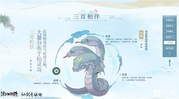 三首现身,福运双至。全新宠物三首蛇妖即将登陆浮世仙灵岛。仙灵岛乃灵气充沛之地,而三首蛇妖善于吸收灵气来强大自己,故大量分布于此岛。蛇妖三首形象不同,性格亦不同,个性调皮,喜欢捉弄主人,但在战斗时,是很可靠的小伙伴,待到有缘之人出现三首将与之结伴而行,一同探索浮世天地!