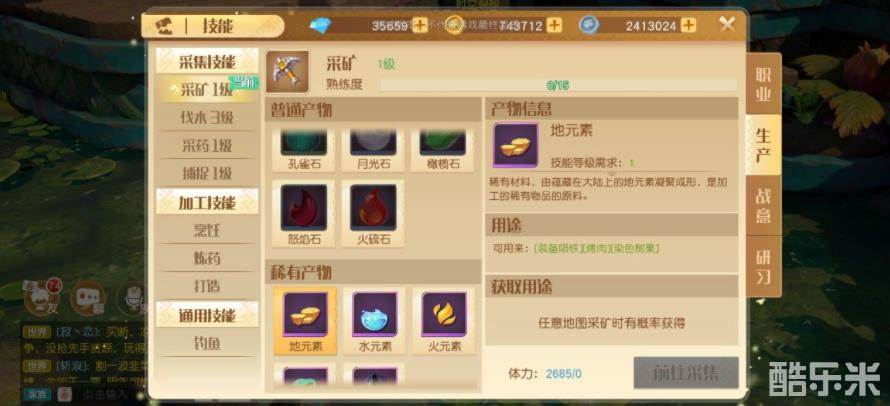 首先采集技能分为采矿、伐木、采药、捕捉和钓鱼这几种,我们可以在相关采集技能栏中查看对应的采集技能熟练度,在使用采集技能的时候需要消耗体力,玩家们可以通过日常活动等方式获得体力,另外在商城中也是可以购买体能饮料来补充体力的。