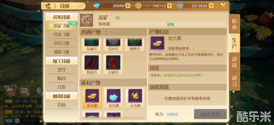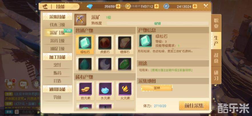 进行生产的时候需要用到的我们通过采矿、伐木、采药、捕捉获得的资源,想要打造更加高级的装备就需要用到更加高级的资源,当我们采集等级提升之后就可以采集到高级资源了。