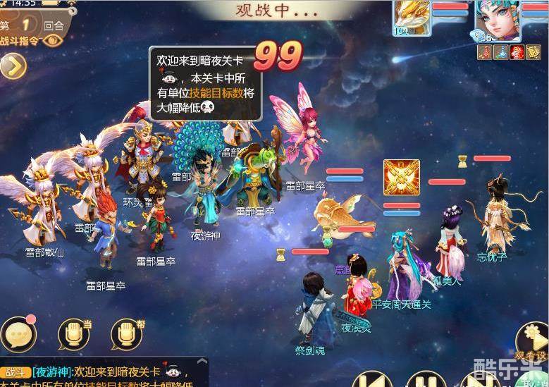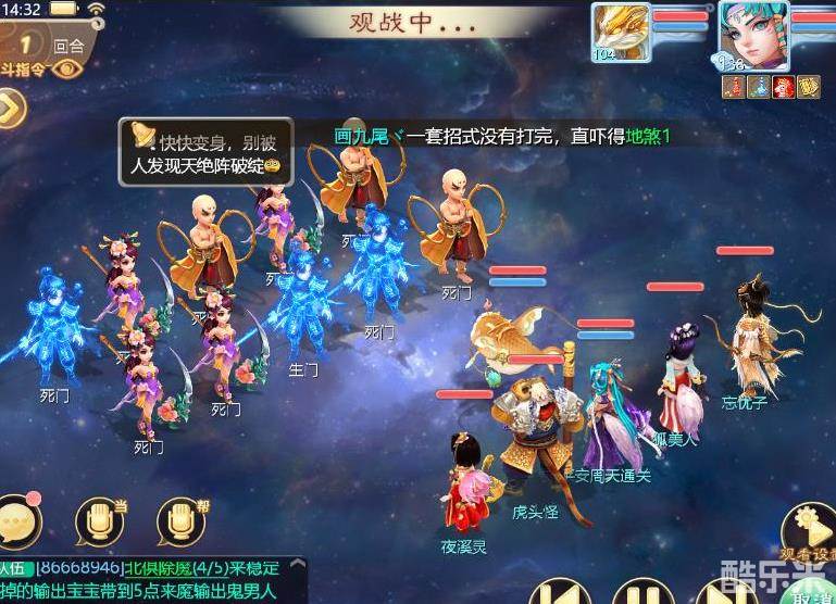 第四十七关:这关前排2个念会群睡,花妖会群毒,要抗雷法,鬼火,和毒,先杀前排左一的念,龙挂治愈,第二回合叫隐身狐狸,如果被睡了,就把花妖拉起来让它放群毒解睡,没什么难度,七套通用。