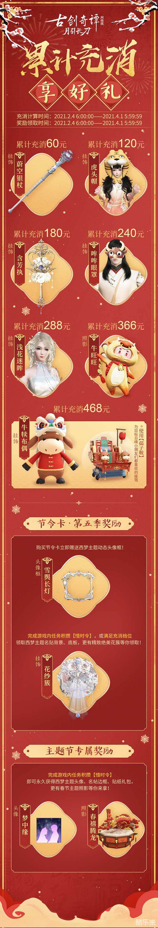 是不是没看够?别着急,持续关注后续爆料,更多新衣美照绝美登场!再来看看新一季的充消好礼与节令卡小物,是否有仙家弟子喜爱的物件?精致美丽的蔚空银杖,保暖可爱的虎头帽,还有风韵雅致的含芳执和萌趣搞怪的哞哞眼罩,各有各的特色;而浅花迷眸装点了美人的脸庞,照影牛旺旺憨态可掬,惹人喜爱;若是以牛犊布偶装饰自身,还能召唤出小朋友们都喜欢的座驾“孺子鞍”呢!