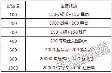【活动内容】活动期间,每消费1000金币,即可获得100好运值,累计获得好运值可开启奖励宝箱。