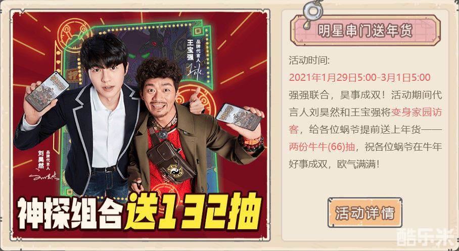 有代言人没有福利怎么行?王宝强、刘昊然化身游戏NPC,带着年货正式抵达玩家的家园。玩家们不但可以和两位实力派演员一对一对话,还能够获得两份牛牛(66)抽!