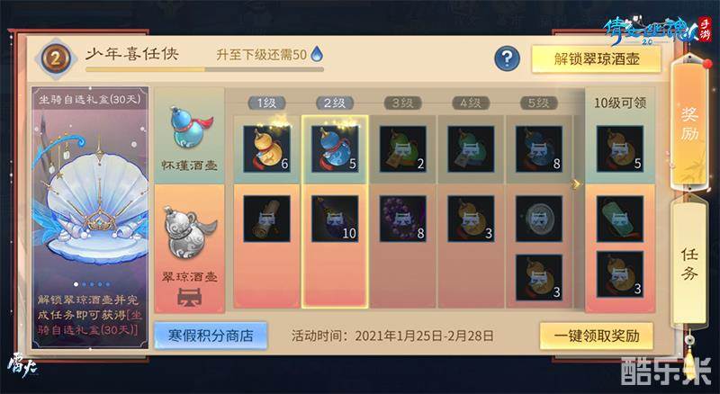 陈王昔时宴平乐,斗酒十千恣欢谑。寒假期间,酒壶任务同步上线:玩家登陆游戏即可获得丰厚奖励。参与日常活动的玩家,还能获得寒假积分兑换多种道具。同时,怀瑾酒壶也将免费限时开放。玩家每日可以通过挑战不同日常任务,获得酒气解锁更多奖励。购买琼翠酒壶的玩家可以获得五款精美坐骑(选一)、武扬令等海量奖励。机会难得,不可错过哦!