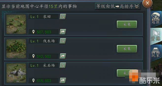 主公们只需在主城内点击右下角的“地图”按钮,就能切换到大地图模式,然后点击右上角的雷达,会显示出主城附近的资源点信息,选择“采集”则可派出指定部队前往占领资源点并采集资源。