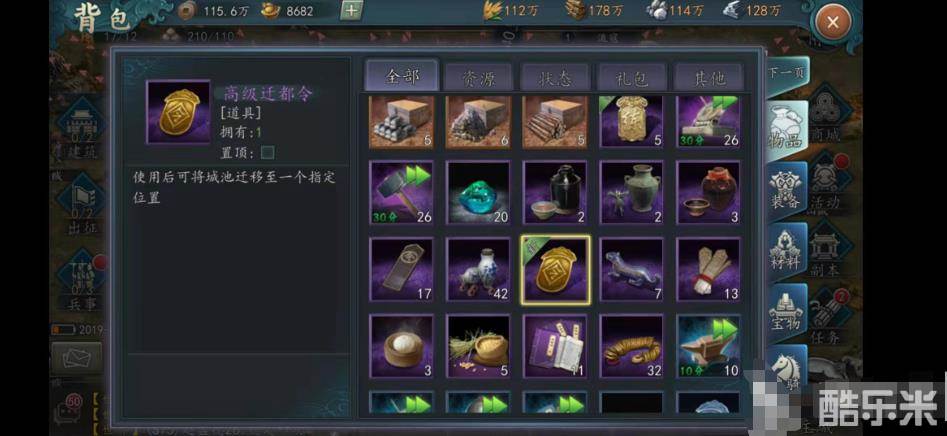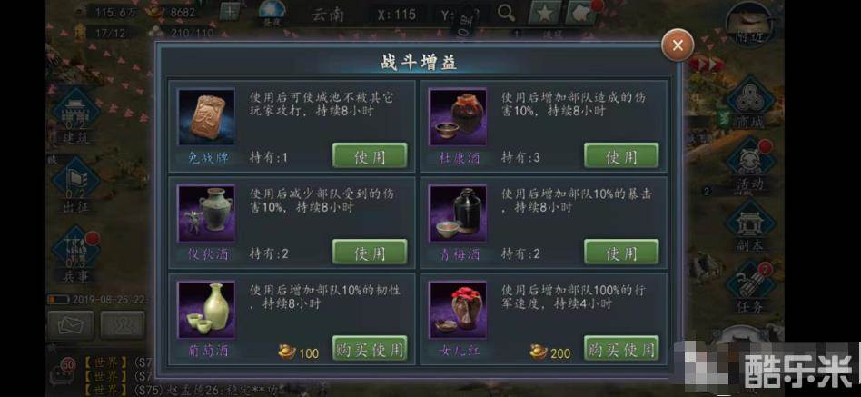 再就是要准备好足够的道具,首先我们要准备好增益的道具,比如杜康酒(增加伤害10%)、青梅酒(增加暴击10%)、仪狄酒(减少受到的伤害10%)、葡萄酒(增加韧性10%),以及增加100%行军速度的女儿红,行军丸以及粮草资源以及增加招兵和治疗伤病的加速令牌。