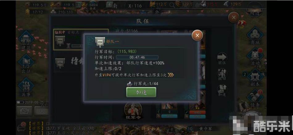 因为我们的城池距离南蛮很远,所以在行军途中要进行加速使用行军丸每次可以加速100%,根据VIP等级不同可加速的次数也不同,最低可以加速2次。这时候我们要喝下之前准备的各种美酒,把状态提高的最好。
