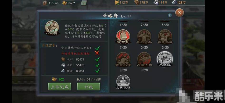 在计略的选择上,我们选择的是增加自身攻击的一鼓作气和使敌方受到伤害加深的八卦阵的组合,这样一增一减,又可以提高不少伤害。军械上当然是带战鼓,把伤害输出最大化。