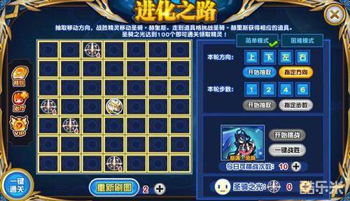 抽取移动方向,战胜精灵移动圣骑•赫里斯。走到道具格挑战圣骑•赫里斯获得相应的道具。当圣骑之光达到100个时即可通关领取精灵!