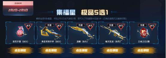 集福星 极品5选1!2.2-2.5日活动期间,小伙伴们只需解锁全部6张福星卡,并在2.5日当天游戏1局,即可在5款极品道具奖励莲花手雷(永久)、黄金军用手斧(永久)、龙鳞(永久)、破天狂龙(永久)、王者之石*1奖励中任选1件获取哦~