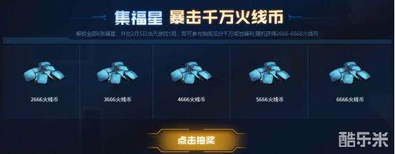 集福星 暴击千万火线币!小伙伴们在活动期间,解锁全部6张福星,并在2.5日当天游戏一局,即可参与抽奖瓜分千万奖励福利,其中还可以随机获得2666-6666火线币奖励哦~如此豪华的火线币补给,老哥们看来今年的极品火线币专属道具稳稳的啦~