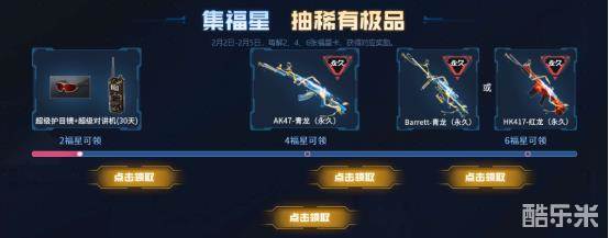 集福星 抽稀有极品!活动期间2月2日-2月5日,小伙伴们每解锁2、4、6张福星卡,即可领取对应的极品道具福利补给哦~解锁2张福星卡时直接领取超级护目镜+超级对讲机(30天)、4福星时即可直接领取AK47-青龙(永久)、6级福星时即可在Barrett-青龙(永久)或HK417-红龙(永久)道具中任选一件获取~