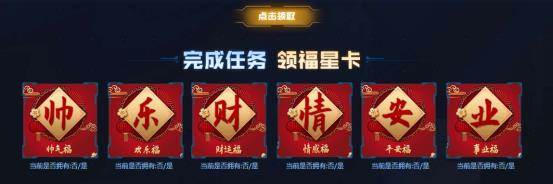完成任务 领福星卡!小伙伴们在活动期间完成对应的福星任务,即可领取福星卡片哦~6张对应不同的福星卡片,帅气福、欢乐福、财运福、情感福、平安福、事业福等你来领取!是时候集齐我们的6张福星卡啦!