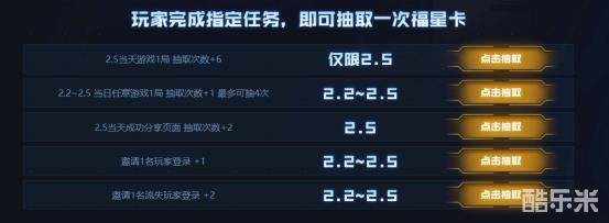 完成指定任务,即可抽取一次福星卡!活动期间,小伙伴们完成指定的福星卡任务,即可参与抽取一次福星卡!共有5条专属福星卡任务等你来解锁!其中最不容错过的任务,仅限2.5日小伙伴们当天游戏1局,即可获取抽奖6次的机会~喜欢的老哥们,记得到时参与我们的集福星活动吧!