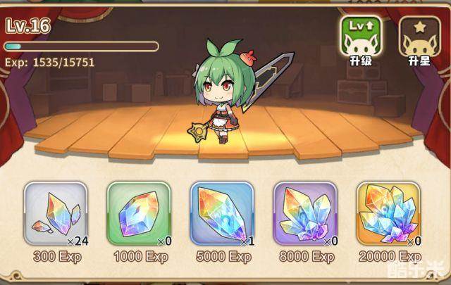 即角色强化,可以通过使用各类魔素结晶(类似于RPG游戏的经验书、经验糖)直接给予经验值;角色经验也可以在战斗和演出中获取;可以长按强化;(注:强化没有确认和预览,点击魔素结晶即强化);