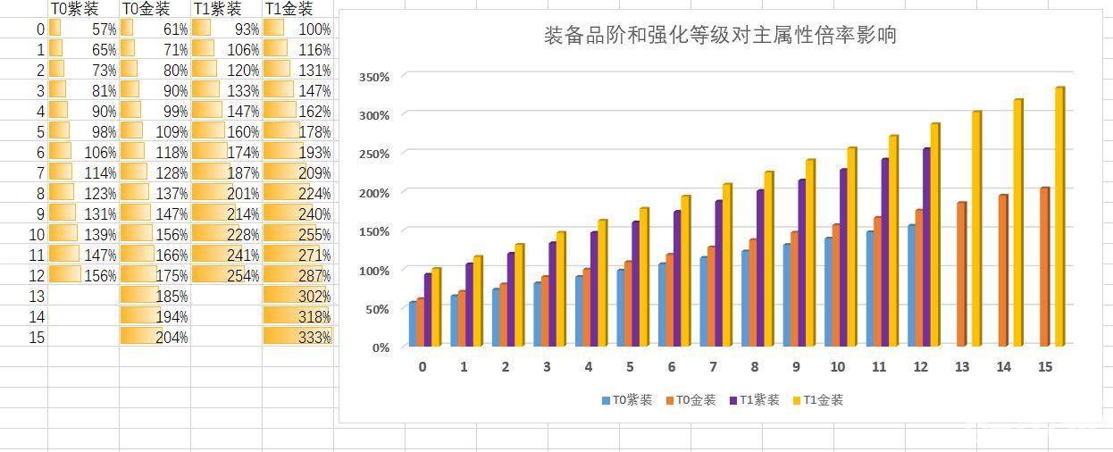 每个强化等级提升的属性值均等,金装用15个强化等级提升233%,紫装用12个强化等级提升175%
