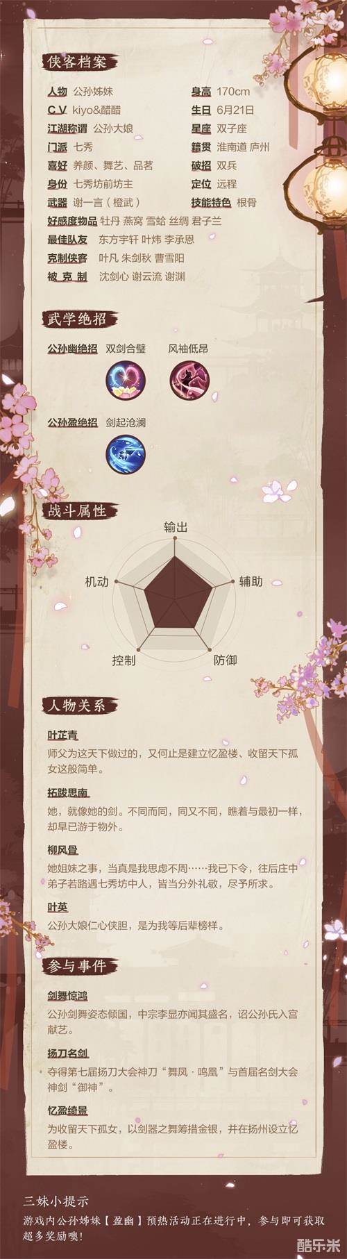 绮舞矜剑掠风雨,浮影清迴忆盈阁。全新侠客【公孙姊妹】人设揭晓,三妹带你30秒速识姊妹二人!目前【盈幽】活动正在持续进行中,超多好礼等你来拿!