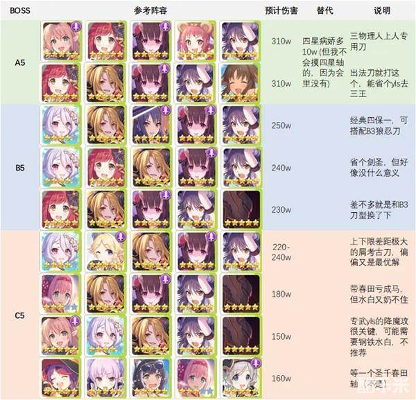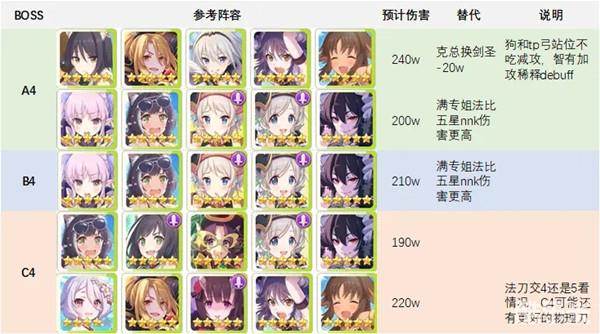 这次的四王是新面孔,小技能那个降物攻数值很高,非常恶心物理队(即使如此法刀还是打不过物理刀,悲),本期在A4这里出物三还是法刀将成为公会首日排名的分水岭。物理刀的话,狗和tp弓站位在领域外不吃减攻,必上;智和病娇由于自身有特大加攻,能稀释降攻的影响,也是不错的打手位选择,剩下一个除狼外的副破,克总、剑圣、忍都可以上。如果选择出法刀,可以用5x满专姐法替换掉nnk的助战位(看会里有无jjc天王做贡献了),另外不要以为yly在一号位不吃攻击就万事大吉了,被降了魔防后自爆真的拦都拦不住。。。