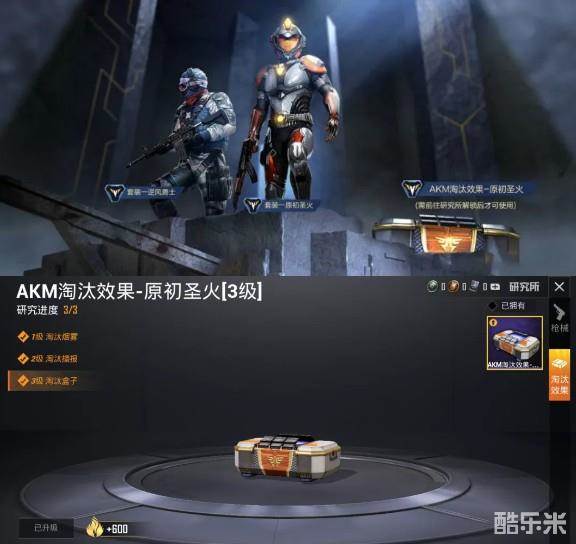 现在特种兵只要购买了精英手册豪华版,即可获得AKM淘汰效果-原初圣火。获得淘汰效果后需要在研究所升级后装备到对应的枪械上使用,AKM淘汰效果只能安装在AKM上,是不是很酷炫、科技感十足呢。