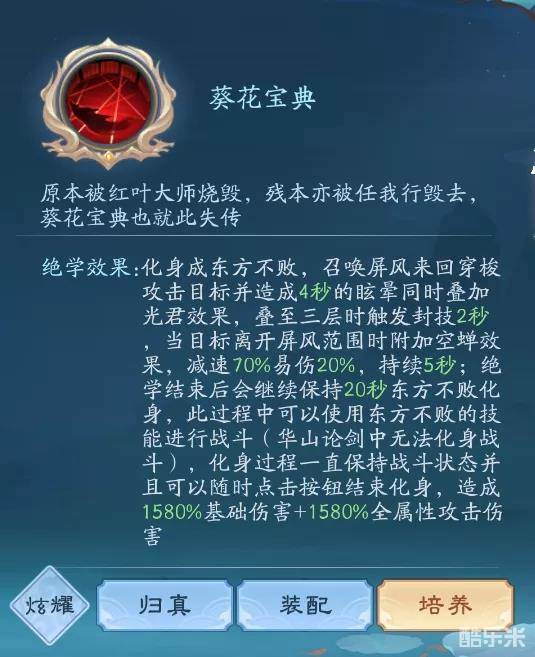 下面来说一个论剑中最顶尖的绝学之一,葵花宝典。虽然它需要120点怒气,是所有绝学里需要怒气值最高的,但真的不亏。从怒气值的积攒来看,个人建议葵花宝典最好作为辅助绝学,然后将另一绝学作为主要绝学,当你攒满怒气,释放另一个绝学的时候,就会富于20怒气,再攒怒气就会变快~只要你能憋的住不点。