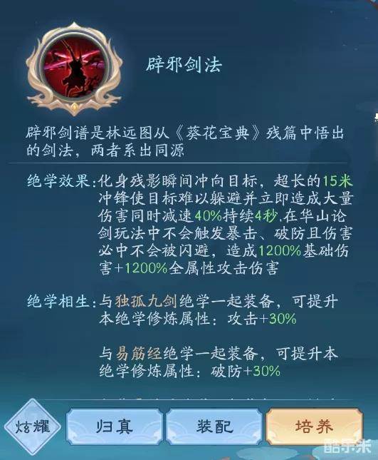 论剑里面辟邪剑法同样也是不可忽视的存在。它的优点:秒伤高,出手速度快,对手不容易躲避。但相对于其他绝学长时间的施法过程让伤害打满变得不太容易,此绝学可以将伤害瞬间打满,将战斗局势立刻拉向我方。当然什么时候出手是至关重要的,一旦被躲掉那么局势就大不相同。日月职业还是比较依赖此绝学,当其残血的时候,能打出爆炸伤害。