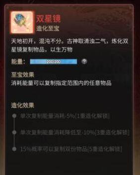 该至宝的效果正与能量消耗的效果相似,修士们可以复制多种炼器辅材和各类丹药,这相当于各种珍宝可以获得2份。许多功能需要消耗一定数量的珍宝,这时候双星镜的功效便发挥了作用。