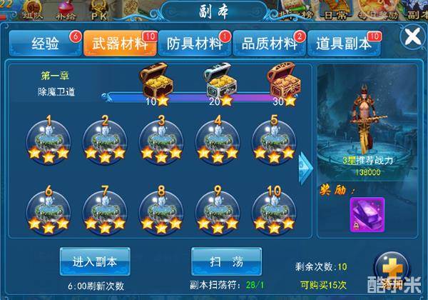 首先我们要知道武器副本需要通过30级主线任务才能开启。从三十级开始,每十级开启一个章节的武器副本,每个章节有10个关卡,每个关卡按照通过的时间会给出星级评分,满分三颗星。只有通过了上一个关卡并且等级达到了下一关卡的等级才能开启下一关卡。