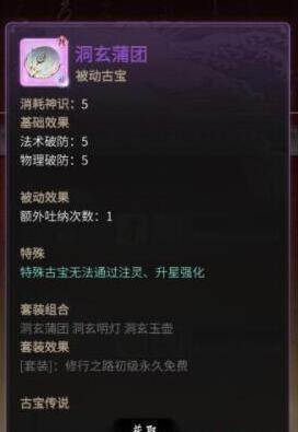 洞玄蒲团属于被动型古宝,其有着不俗的破防能力,在法术和物理两方面都较为均衡。破防及减小对手的防御力,有利于修士直接有效的进行打击。