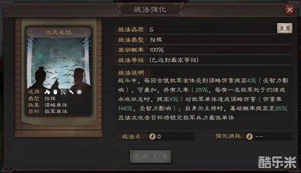 指挥战法,每回合使敌军全体受到的谋略伤害提高4%,并且有概率(每有一名敌军处于灼烧或水攻状态时提高4%)对敌方单体造成谋略伤害,当自身为主将时【江天长焰】的基础概率提升且谋略伤害将锁定敌方兵力最低武将。