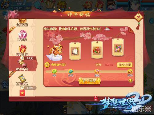 2月4日维护后,达到活跃度获得神牛金币,选择心愿后向神牛祈福获得福气值后可获得奖励。