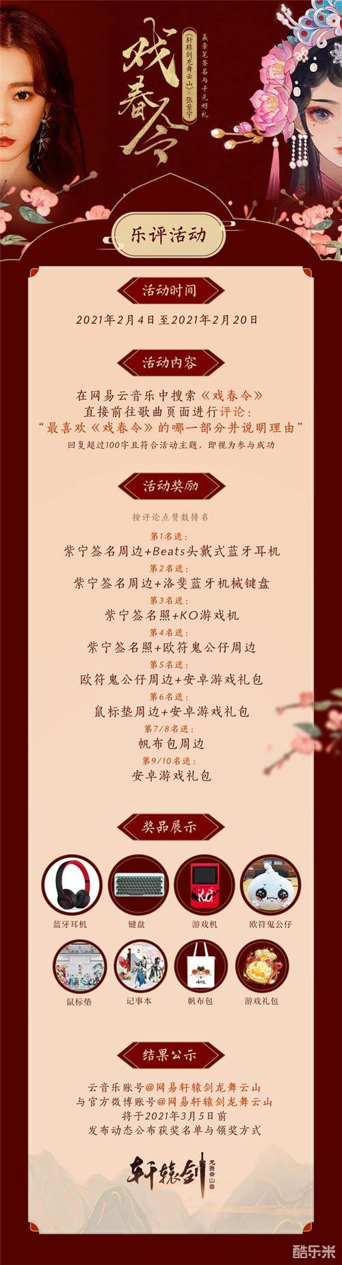 官方乐评活动也已惊喜开启,即日起至2月20日,在网易云音乐《戏春令》歌曲页面内(链接:https://music.163.com/song?id=1817110688),评论“你最喜欢《戏春令》的哪一部分并说明理由”,有机会获得Beats耳机、洛斐蓝牙键盘、KO游戏机、紫宁签名周边与签名照等等好礼!