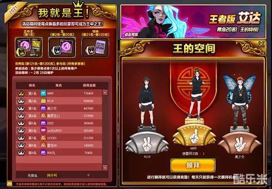 活动期间使用点券最多的玩家成为王中之王!活动期间使用点券至少1次以上。