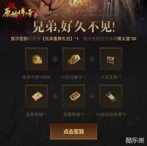 首次签到可获得【兄弟重聚礼包】*1,每次签到还可获得情义值*20。
