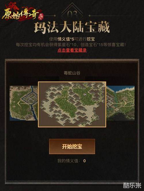 使用情义值*5可进行挖宝,每次挖宝均有机会获得紫星石*10、创造宝石*15等惊喜宝藏!