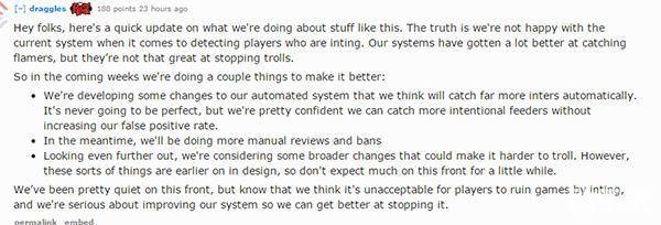 这位名叫Draggles的官方人员在回复中指出,虽然现在的系统比起以前有了些明显的改善,但显然不能完全制止那些消极玩家们。但在接下来的几周,他们会做出一些改善。首先,将对自动侦测系统做一些研发和改动,可以更好的自动去侦测那些故意送人头的玩家们。虽然可能达不到100%,但他们确信可以侦测到更多故意送的玩家并对其进行制裁。同时,除了自动化的侦测系统外,还会投入更多的人工审查。而未来拳头会进行一些重大的改动来防止消极玩家。