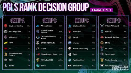 在2月5日至2月7日三天内,参加PGI.S的全部32支参赛战队通过随机抽签,分为4小组,每小组8支战队,进行为期三天每天8场、共24场的赛前排位赛(Rank Decision),最终根据各战队一轮比赛总积分排名,决定第一周周中生存战的参赛名额。排位赛最终排名前16名队伍和后16名队伍,将分别以不同形式参与首周周赛(Weekly Series)。代表PCL赛区参加本次PGI.S的六支战队中,4AM以及TSG共同位于A组,iFTY、MCG以及PERO战队共同位于C组,Tianba则位于D组。32支战队具体分组情况如下: