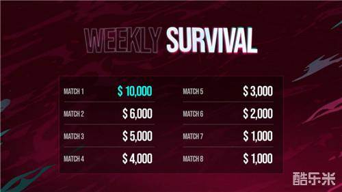 每周16场周中生存赛中,前8场比赛吃鸡战队将获得不等额奖金,奖金数额依次递减,第9-16场比赛吃鸡队伍,也将直通当周周末决赛,但不会获得额外奖金。