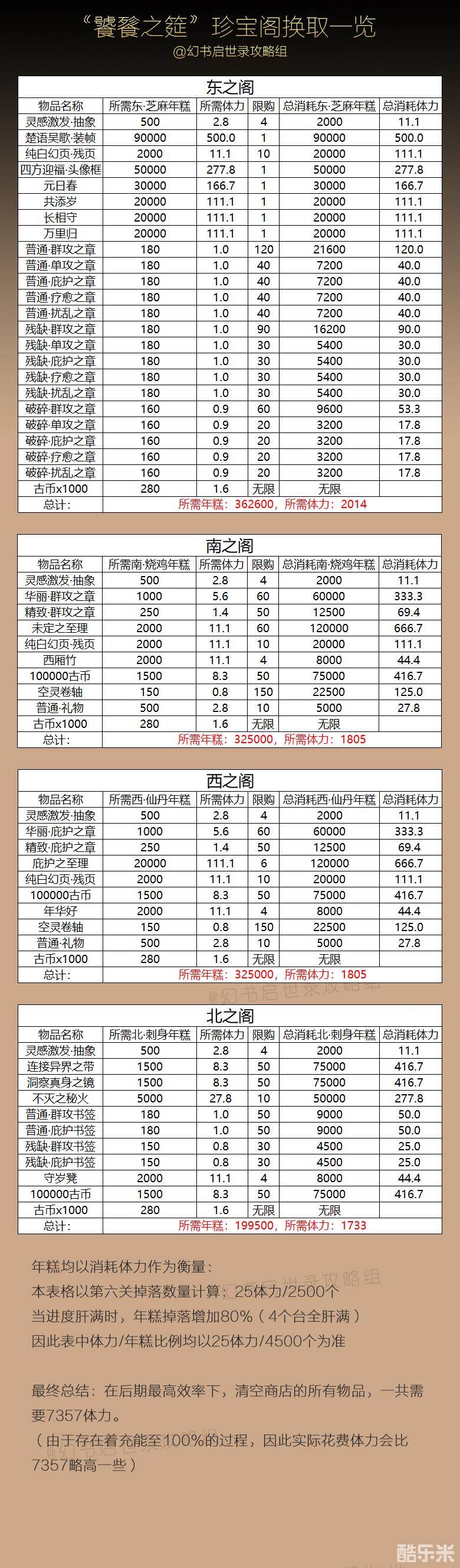 本表格以第六关掉落数量计算:25体力/2500个当进度肝满时,年糕掉落增加80%(4个台全肝满)因此表中体力/年糕比例均以25体力/4500个为准最终总结:在后期最高效率下,清空商店的所有物品,一共需要7357体力。(由于存在着充能至100%的过程,因此实际花费体力会比7357略高一些)