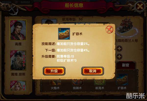 有了好的商船,船长的扩容术的效果也不容小觑。每个船长的扩容术会影响任职船只的仓容,扩容术技能书可以从海事学院获得。公会技能里的船舶科技也可以增加舰队的仓容,加入公会以后一定要记得关注公会船舶科技的等级,让会长优先升级。