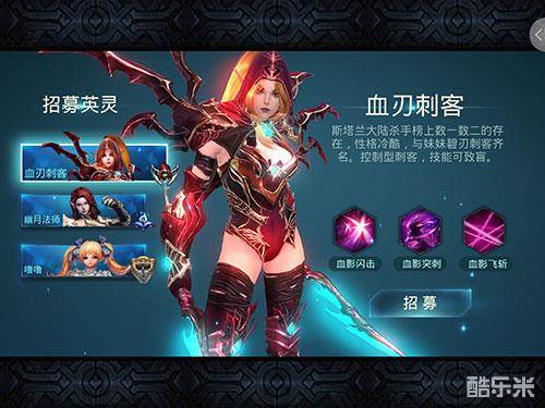 血刃刺客是控制型刺客,外形走的是冷漠御姐风;技能可致盲,突击能力极强,可对单体瞬间打出极高的输出;其一技能血影闪击快速攻击敌方单体两次,造成伤害;其二技能血影突刺突袭到敌方单体面前攻击,造成伤害并使其命中率下降60%;其必杀技血影飞斩飞跃到空中向敌人发出斩击,造成全体伤害,并提高自身速度。