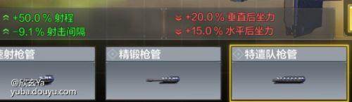我们来看看精锻跟特遣队这两个好兄弟,都加50%射程,特遣队就是多了点射速,相反水平跟垂直后座大幅提高,这个射速就提高了一点,个人觉得没什么用,不如不带,接着看看伤害表现,20M衰减一次40M衰减一次,是不是看到这里大家就想带上这个枪管了