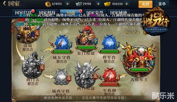 《北凉悍刀行》国家官员可以在每晚9点到次日18点进行敌对国宣战,宣战国和应战国之外,剩下的国家,可以选择帮助宣战国或者应战国。国战需要玩家们集结攻克剑门,然后才能进入敌国王城。在王城中,攻方不仅要击杀敌国防御将士,还要依次击杀王城大将、守门大将,在攻破军机阁和将军台后,集火国战最终BOSS大将军王,方能取得胜利。