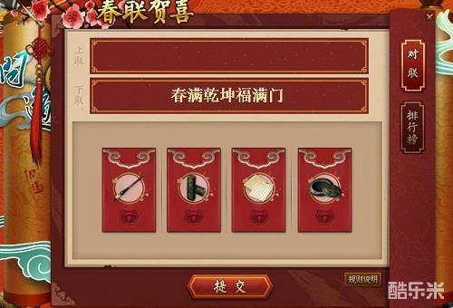 然后我们来讲解一下,《问道》春联贺喜活动。在2月8日至2月21日之间,所有等级大于40的玩家都可以通过活动小图标,打开春联贺喜活动页面。页面中有“笔”“墨”“纸”“砚”四个小任务。玩家可按照任意顺序完成以上任务解锁对联词库,并根据词库内容组合下联,将其提交至排行榜中。之后,所有参与此活动的道友都可以为排行榜中的对联进行投票。