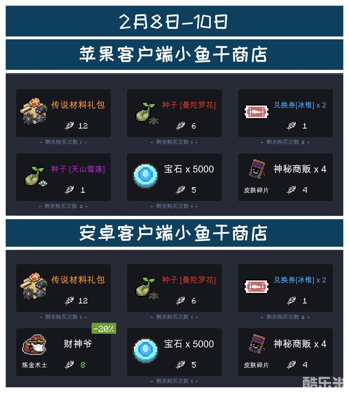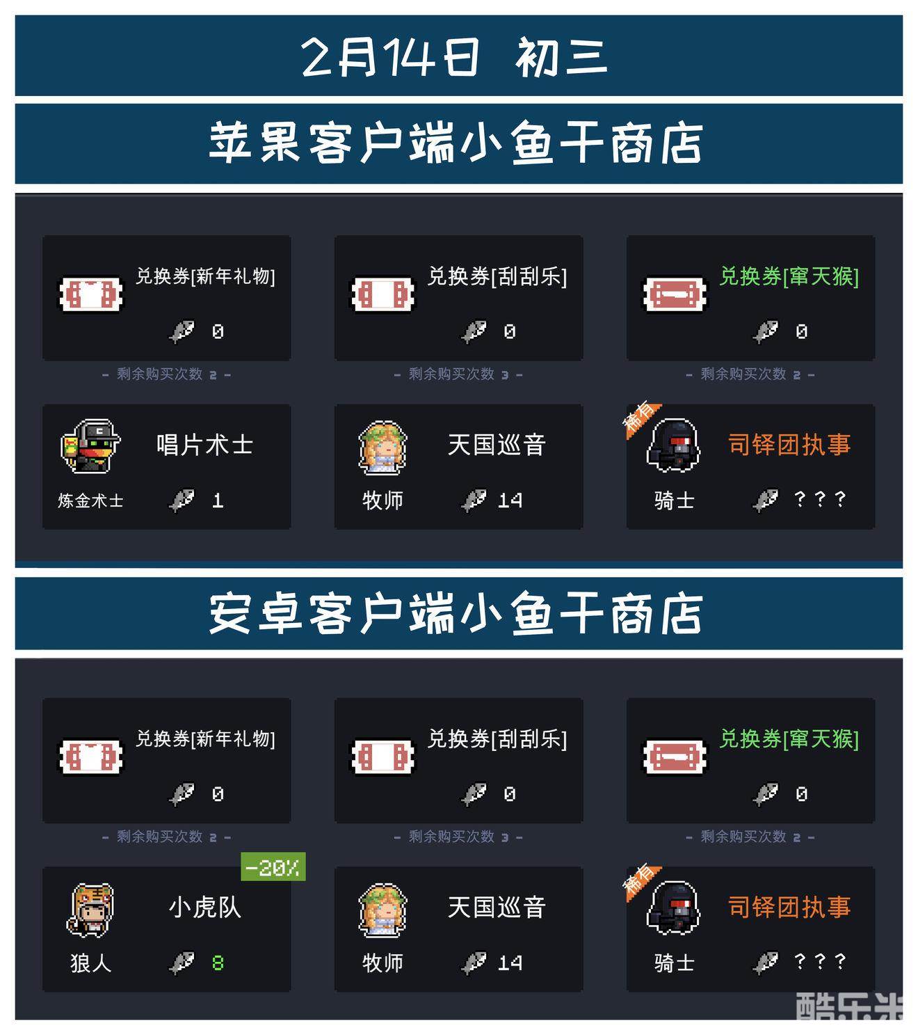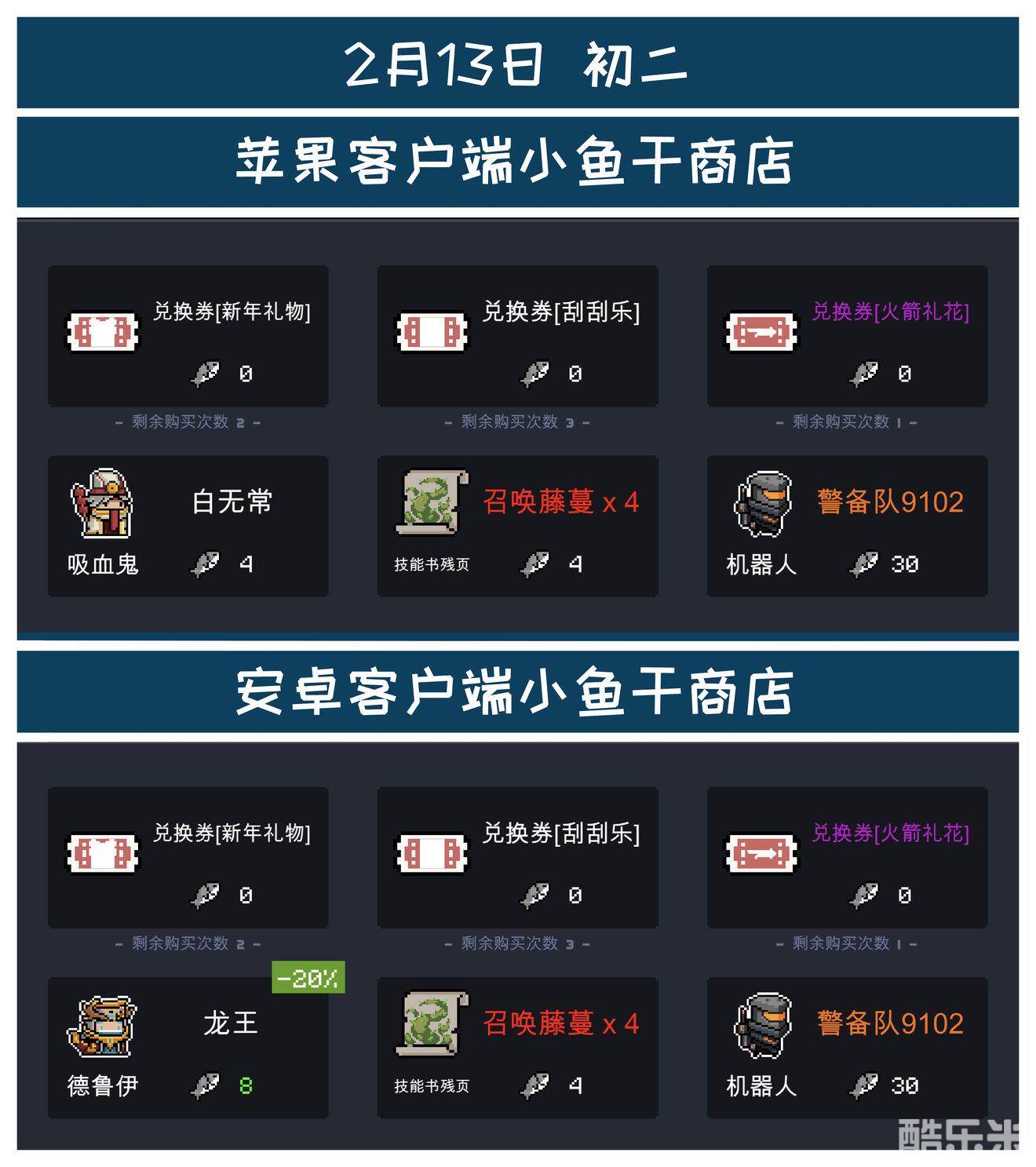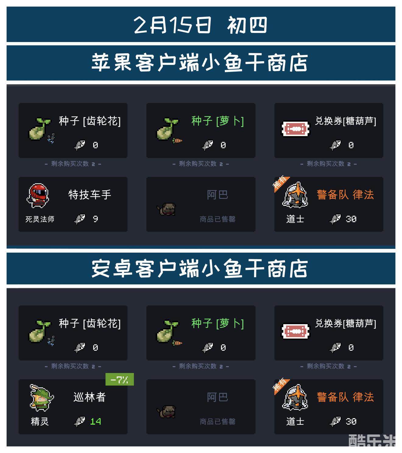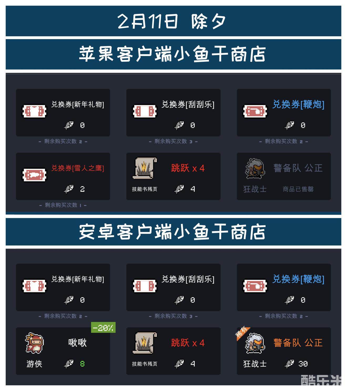 除夕到大年初六(2月11日-2月17日),小鱼干商店每天0点准时刷新!元宵节(2月26日)的小鱼干商店也是当天刷新当天结束!