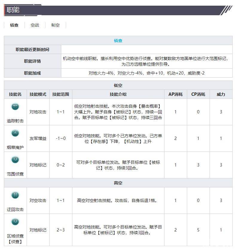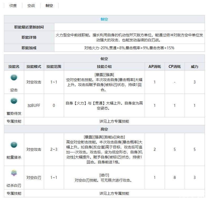 高空对空射击技能。攻击后,降至低空并向后移动两格。下回合攻击后,可对同一目标单位再进行一次攻击。